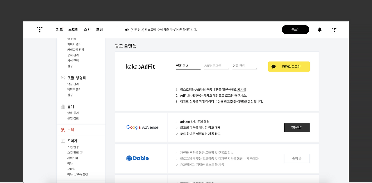 - 티스토리 연동 시 요건(사례성 가이드) :contentReference[oaicite:12]{index=12}